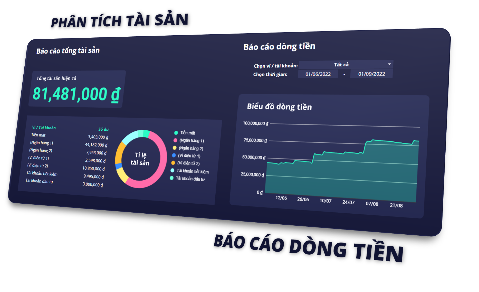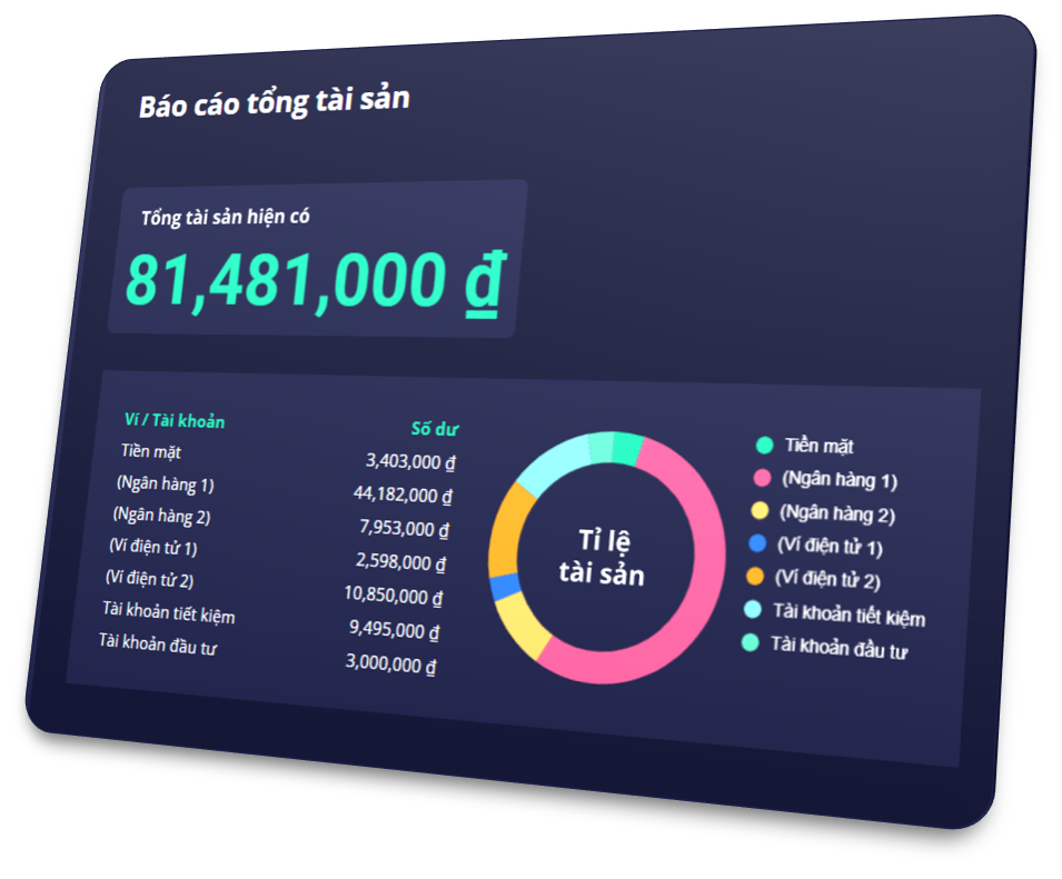 Báo cáo tổng tài sản và phân tích tỉ lệ số dư trong từng ví / tài khoản cụ thể.