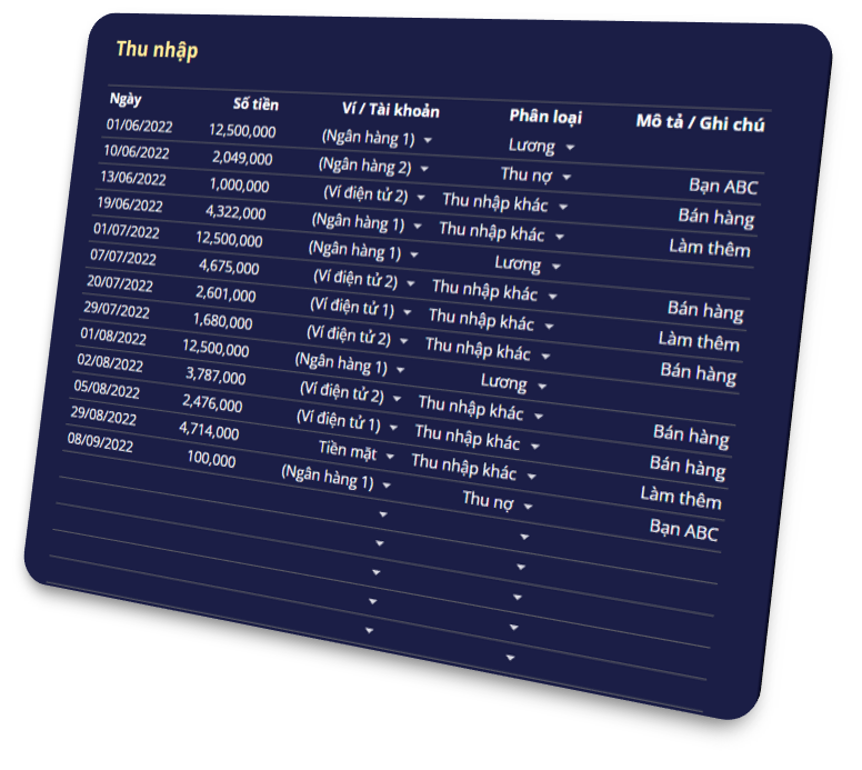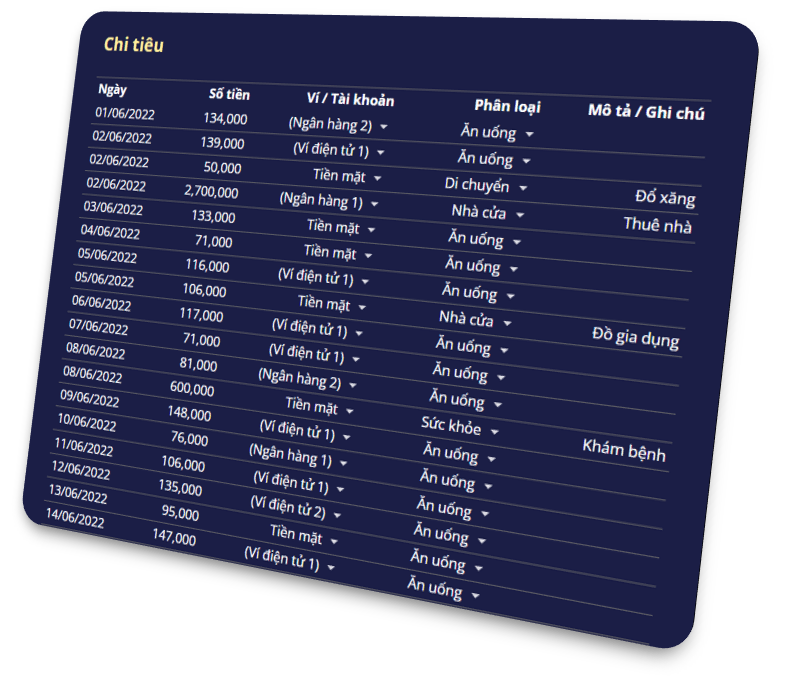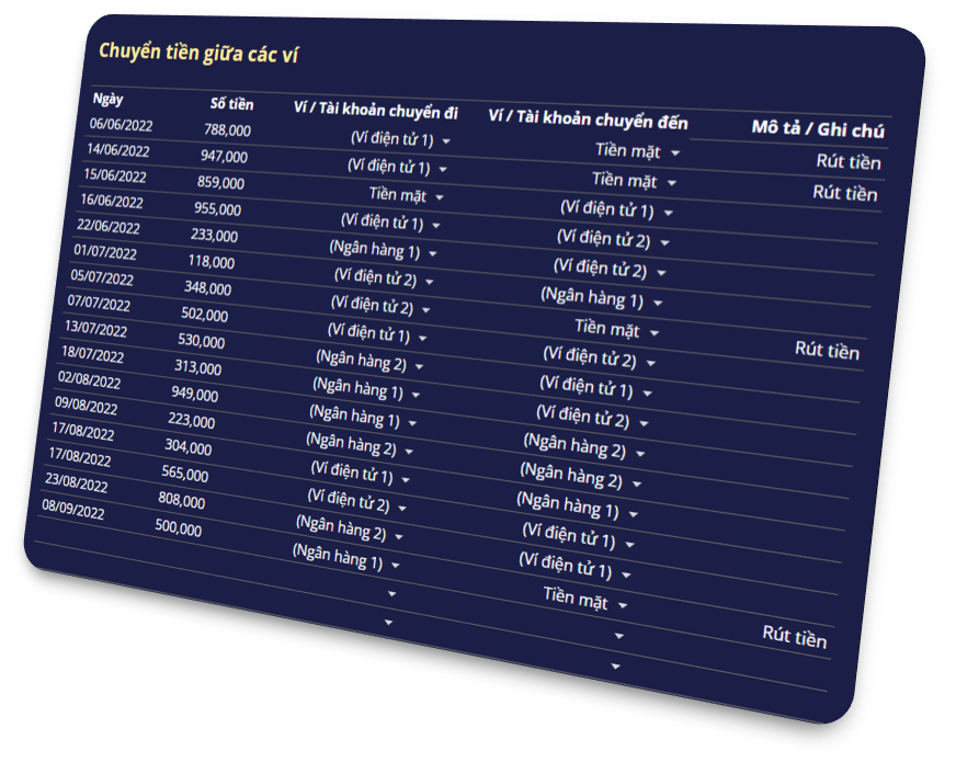 Nơi lưu trữ tất cả giao dịch chi tiêu, thu nhập và các loại giao dịch khác một cách dễ dàng.