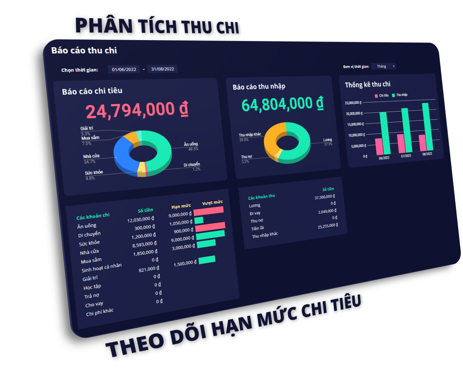 Báo cáo tổng chi tiêu, thu nhập, tỉ lệ và số tiền cụ thể của từng nhóm thu chi.